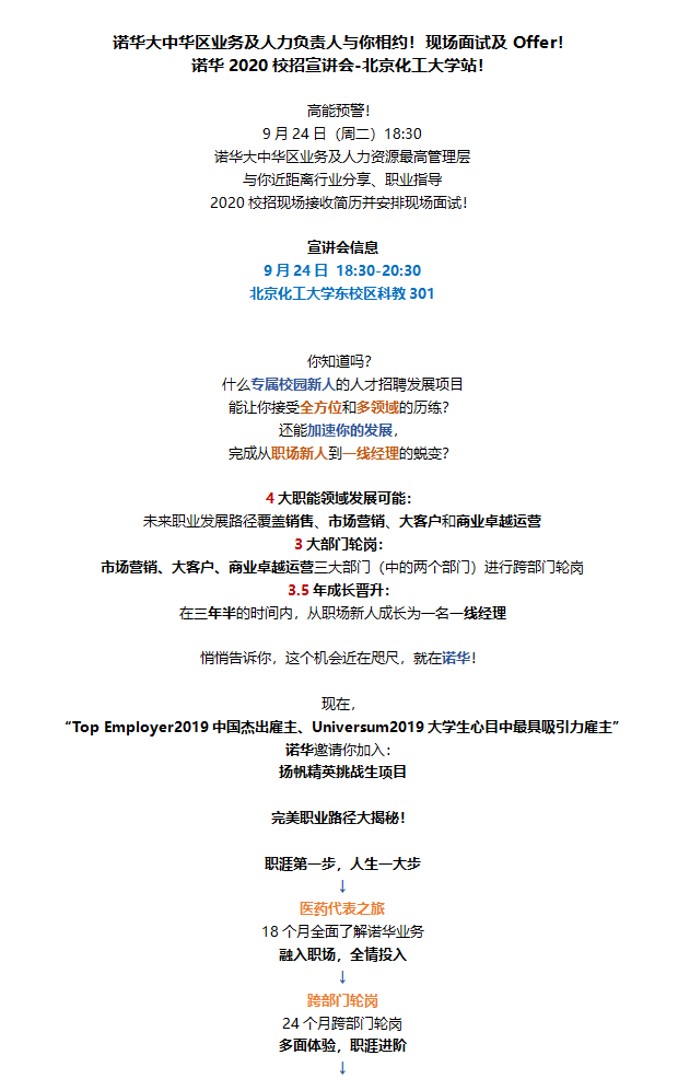 诺华大中华区业务及人力负责人与你相约!现场面试及Offer! 诺华2020校招宣讲会-北京化工大学站!